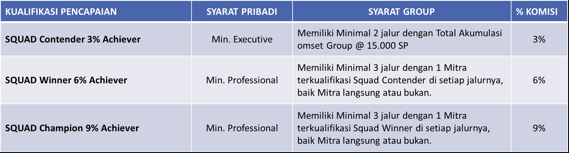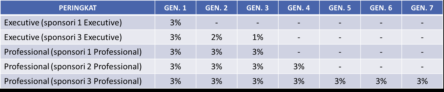 3. Persentase komisi untuk Team Squad & Executive adalah 5%, dan Professional (15%).